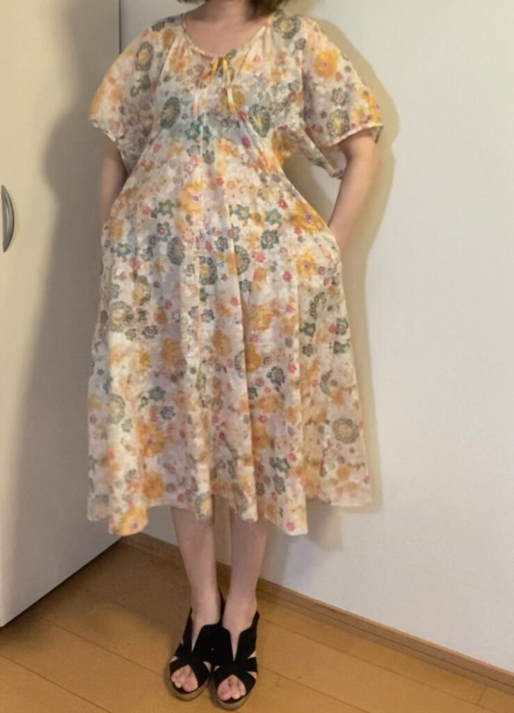 タイのパフラット市場で購入したコットンで作ったワンピースです。涼しくてさらさらしている良い生地です。お安い生地ですが、地模様もあり凝ったデザインです。