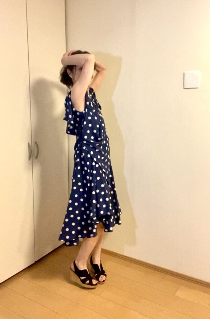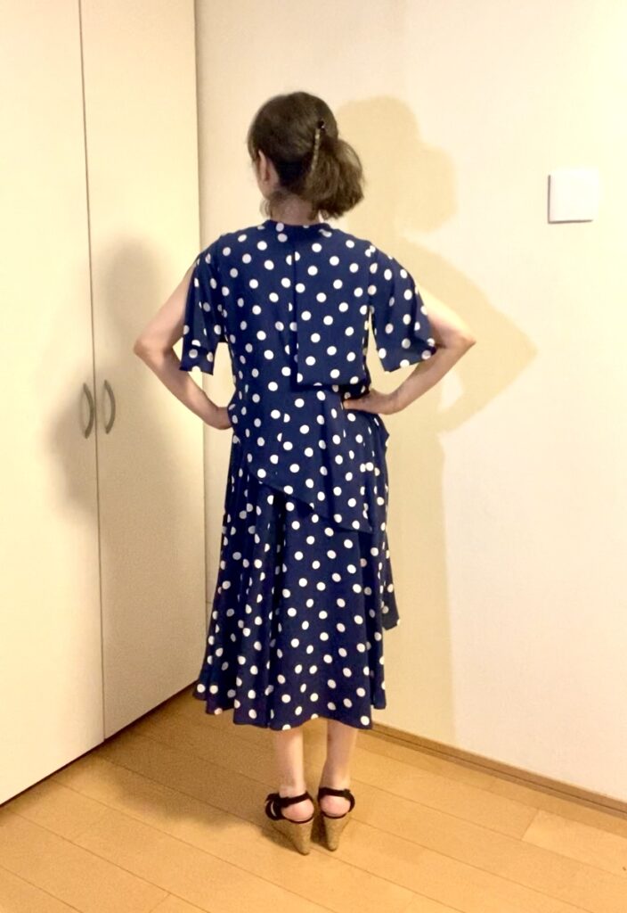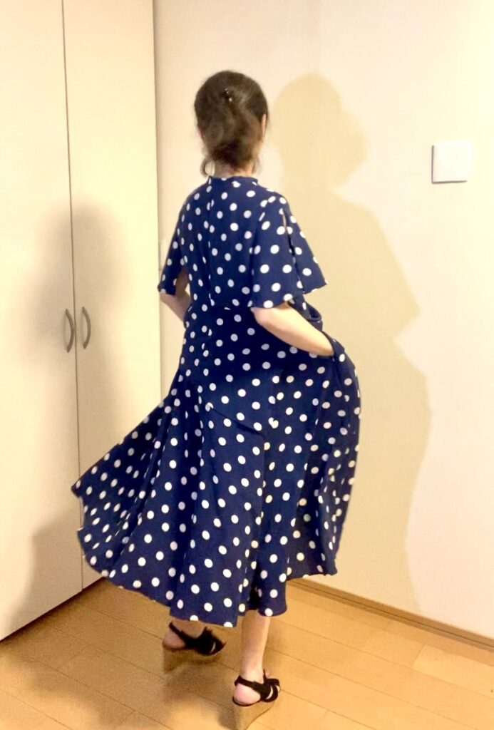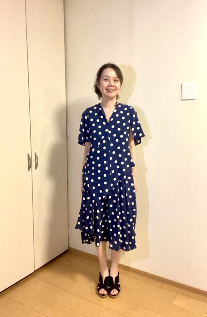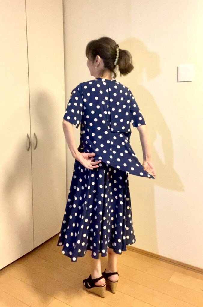 水玉のトリアセテートで作ったレイヤードワンピースです。今年の春に作った物。