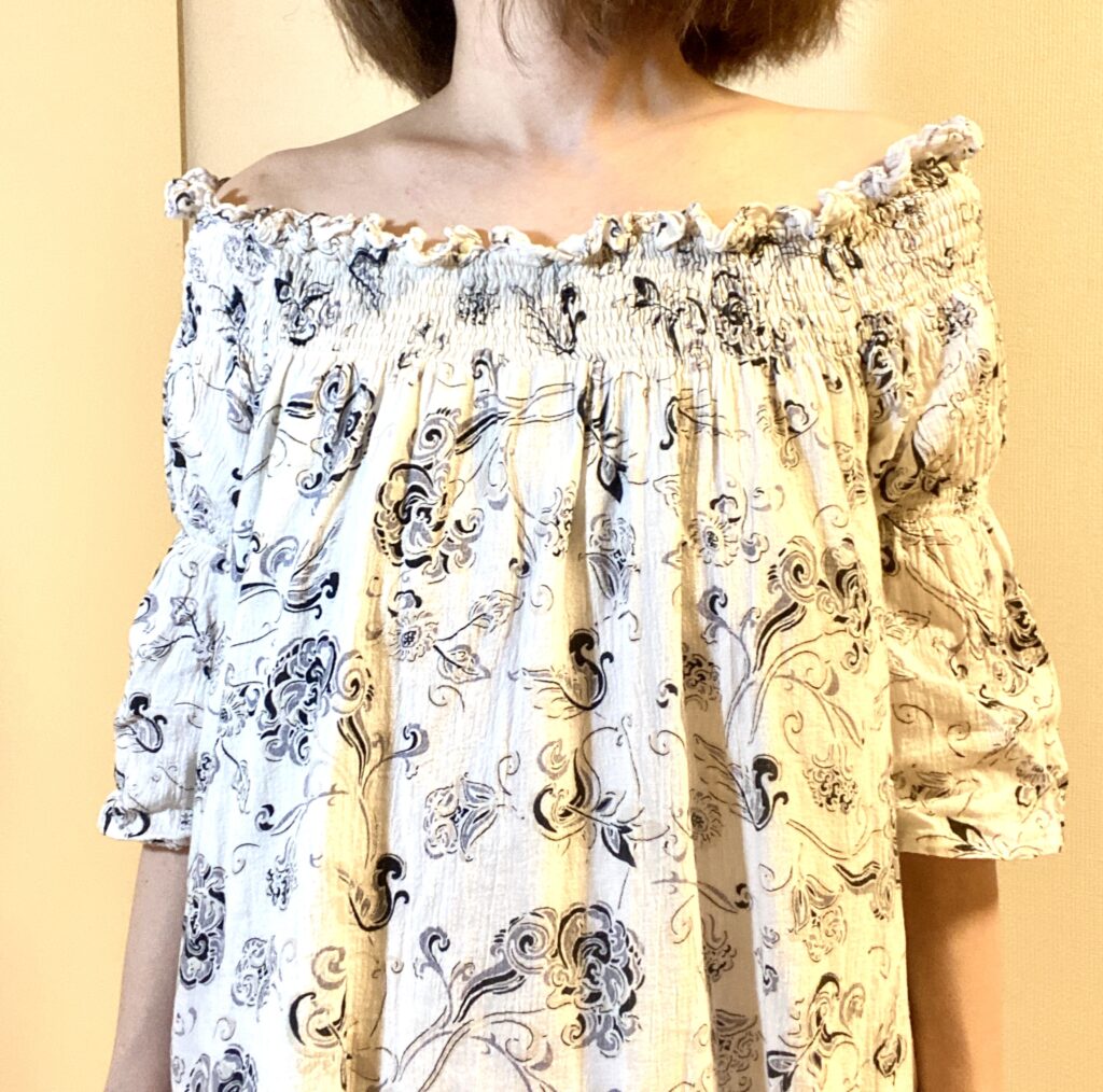 衿ぐりをぐるりと1周したシャーリングワンピース。