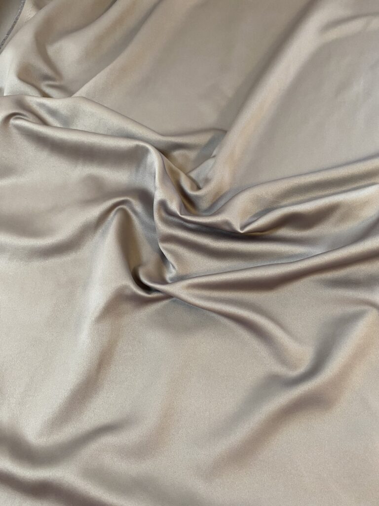 購入した品を紹介します。こちらはポリエステルのマットなサテン地です。お客様のお直しに使う生地を探していました。お客様からお預かりした服を持って探すのですが、なかなか難しいんです。厚みや、色合い、素材など、ぴったりの物を見つけるのは難儀します。