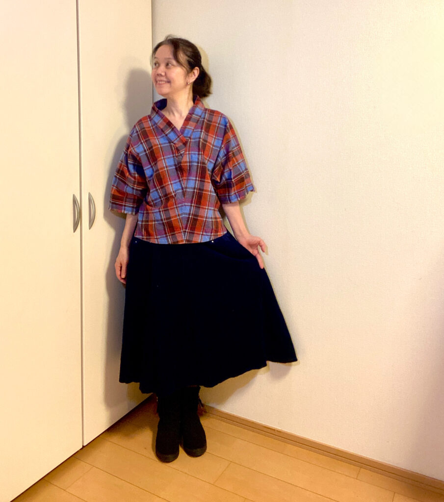 コットンネルの着物衿のシャツにコーデュロイのスカートです。