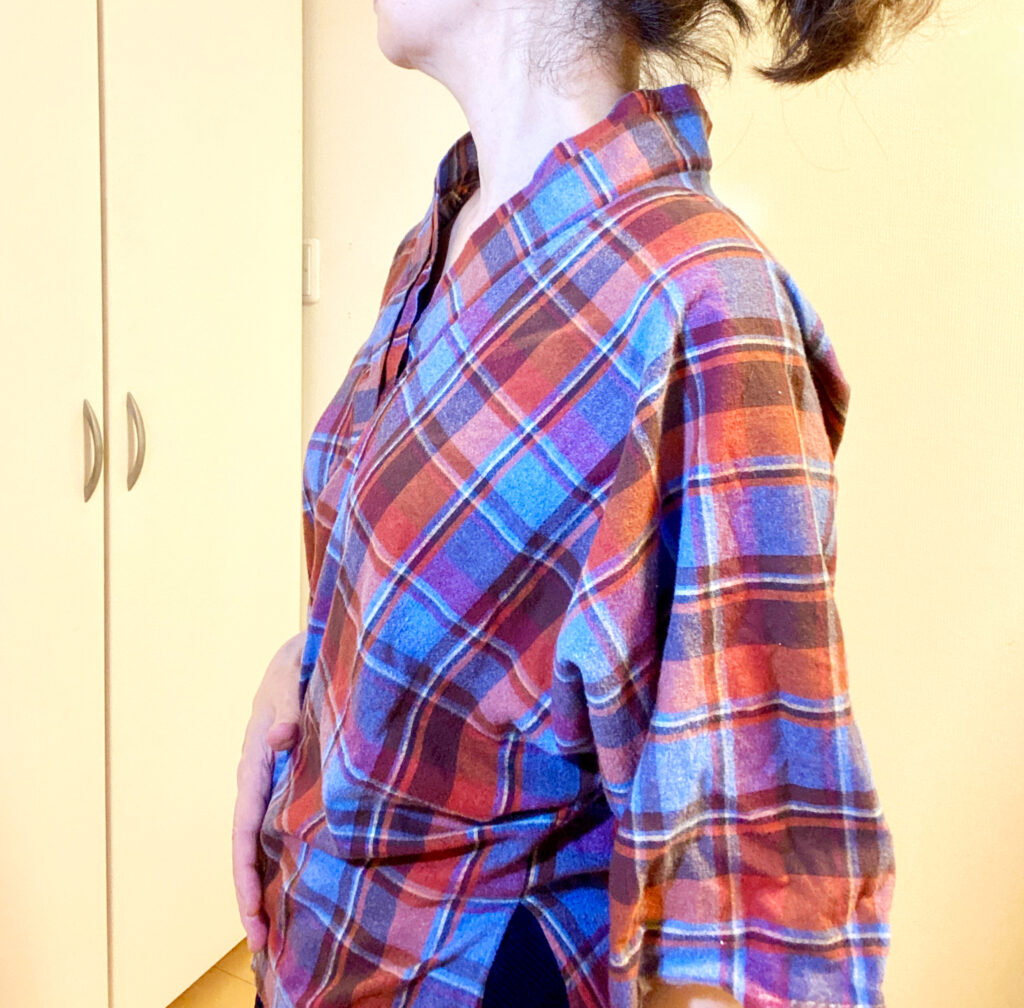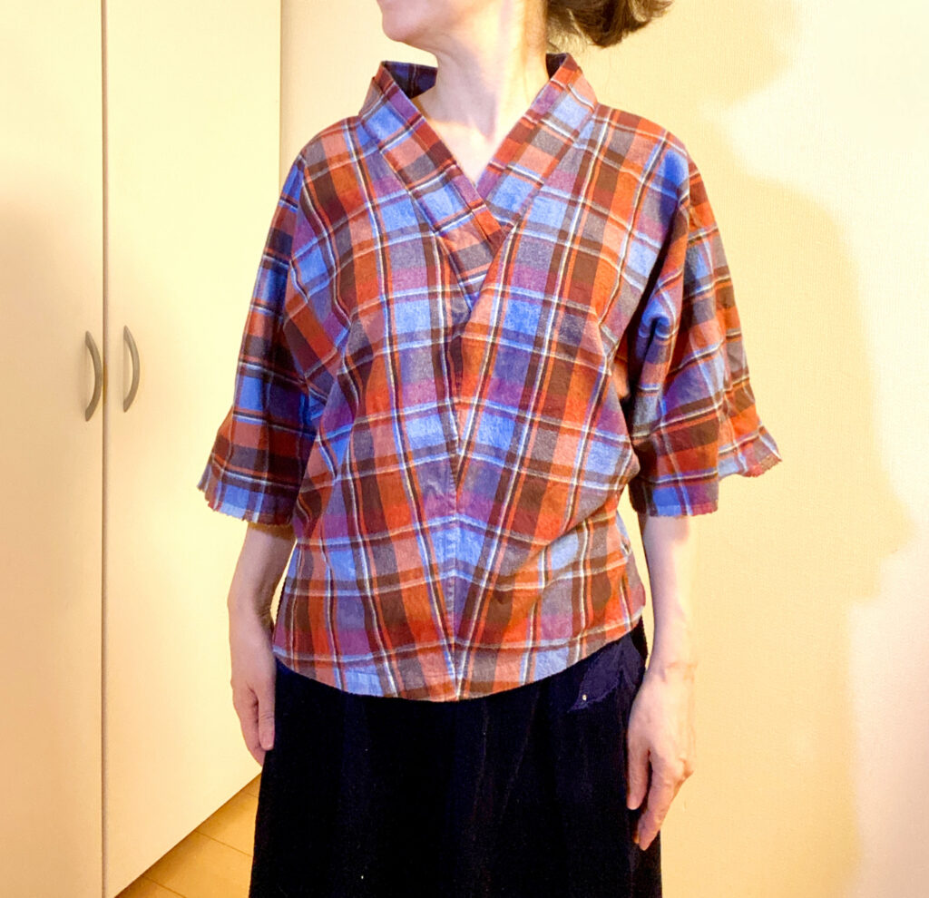 衿は二重にしています。でも、同じ生地を使って柄合わせをぴったりにし過ぎて、あんまり目立たないです。脇の裾にはスリット入れて前後差の長さが違います。