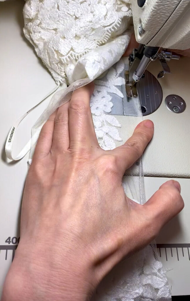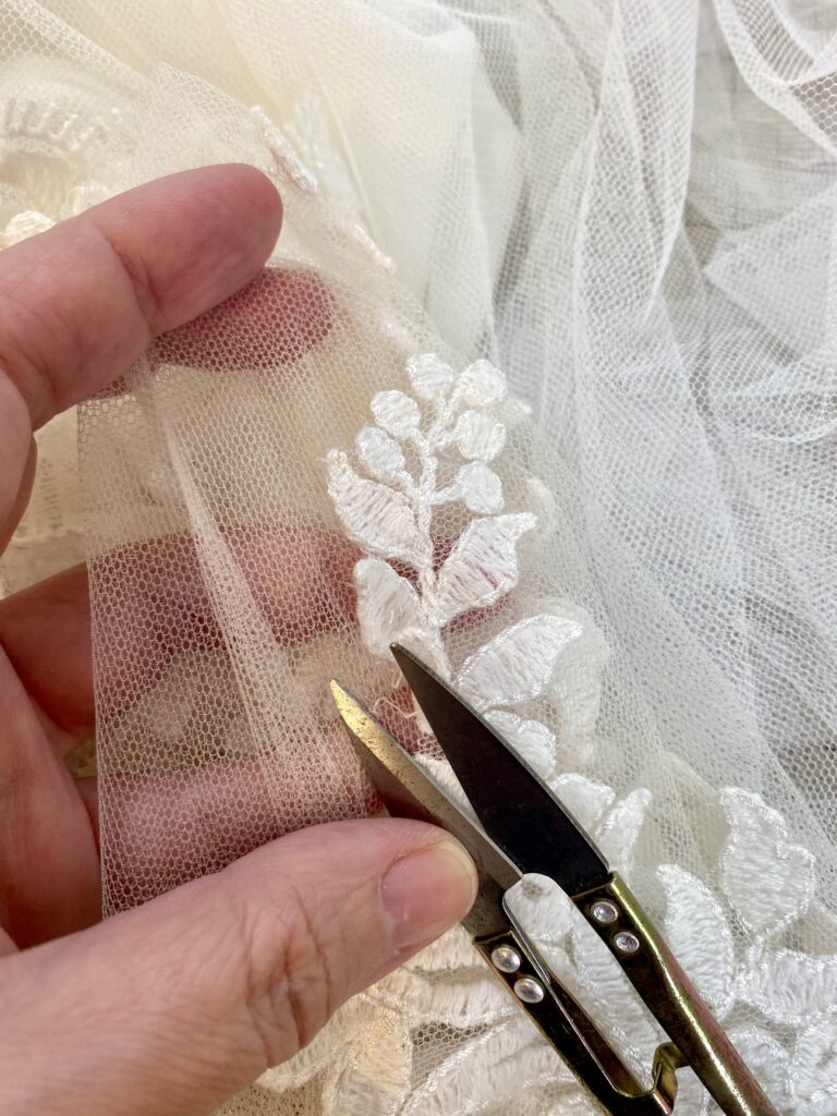 スケスケのチュールレースのお袖です。刺繍モチーフが付いています。事前にモチーフをほどいておきます。