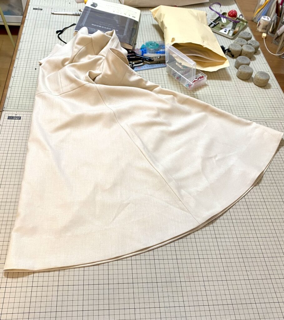 かなりのフレアになっていますね。裾もこの開きに合わせて広がっていくデザインにします。型紙は作りません。布に直接描いていきます。