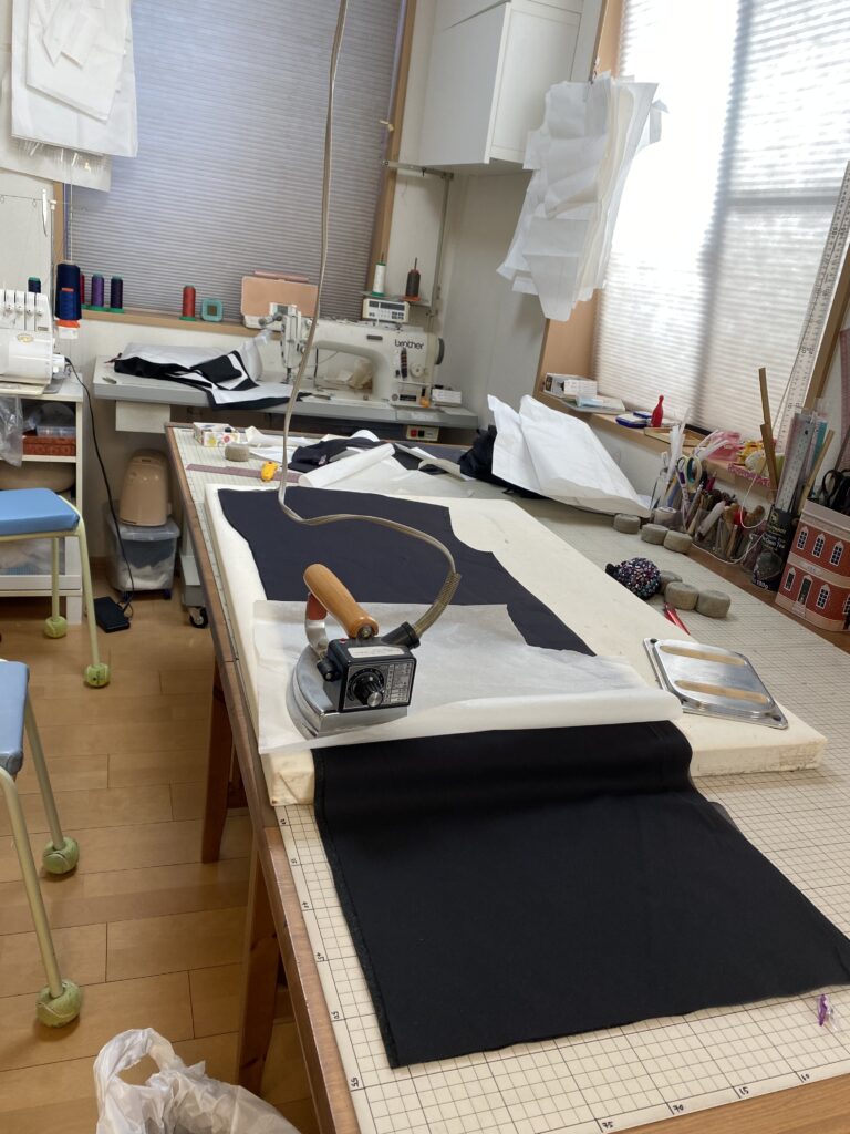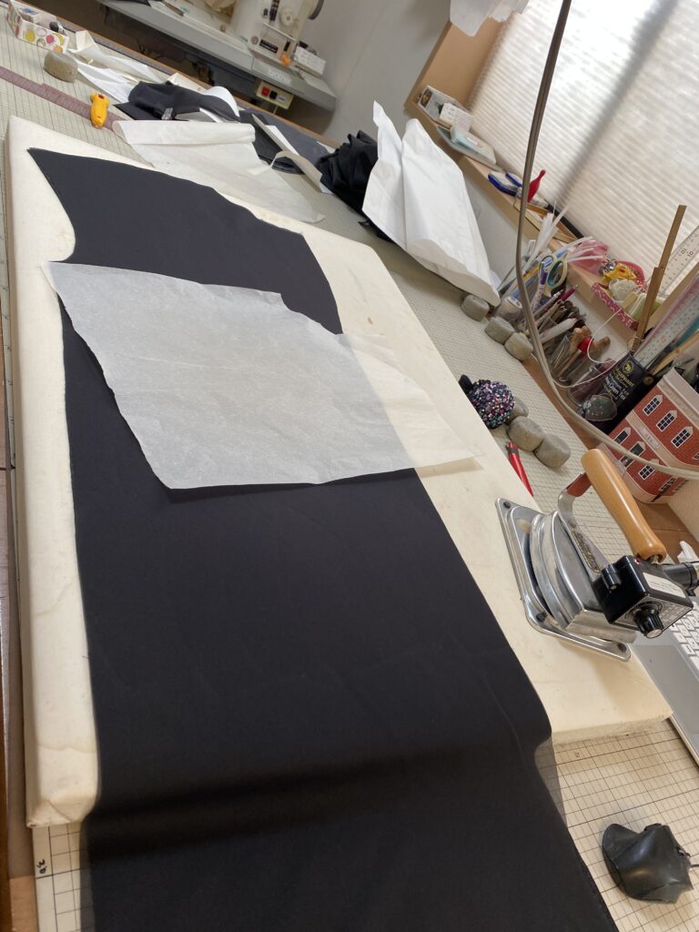 お客様にお越しになっていただき、お仮合わせが終わった所です。ここから、型紙の補正に入ります。大きな修正はありませんでした。良かった!