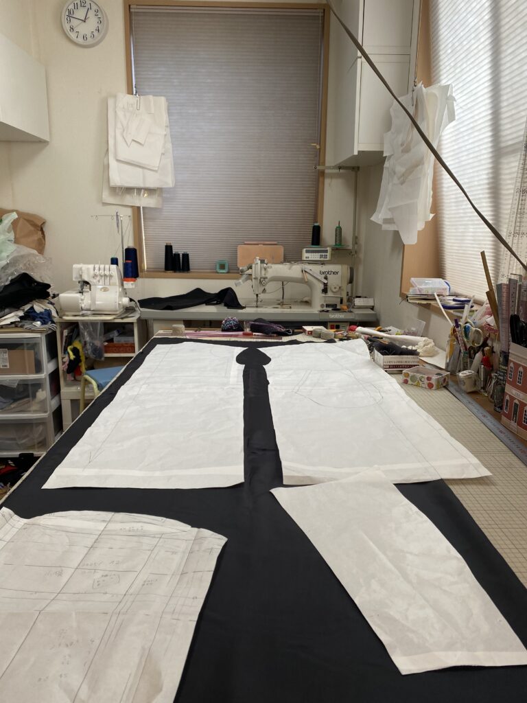 後ろ側です。美しいドレープになっています。場所によって、チャコで印を付けたり、キリビをしたりです。