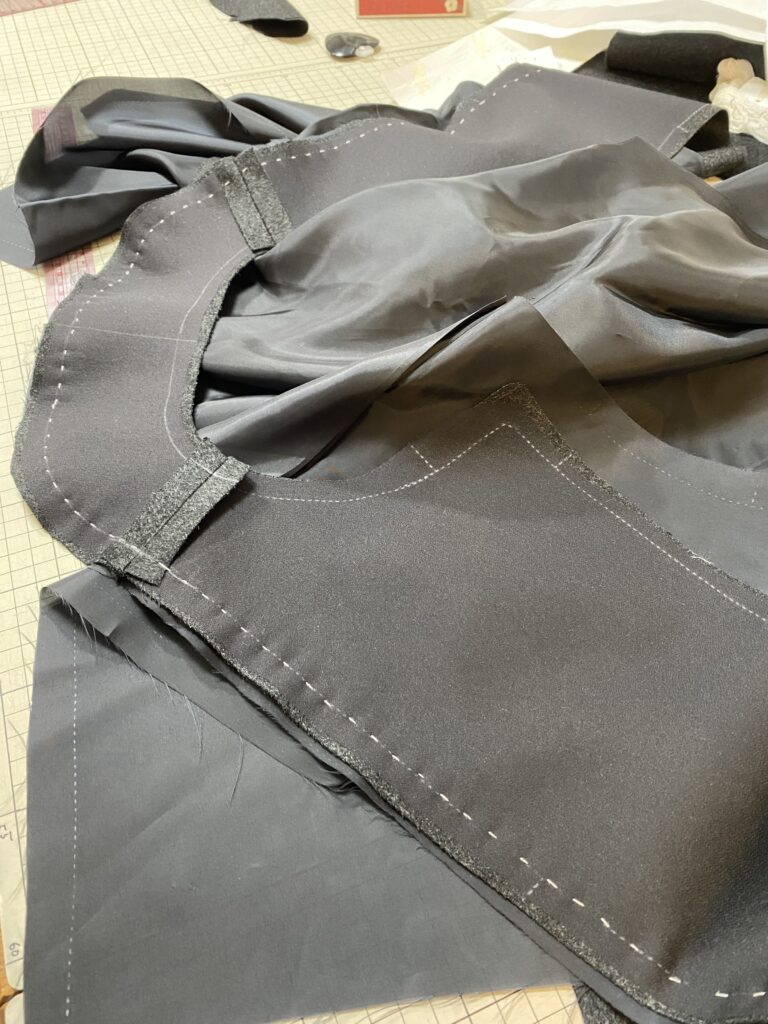見返しと裏地を縫い付けるところです。ここは、しつけをしてから縫っていきます。