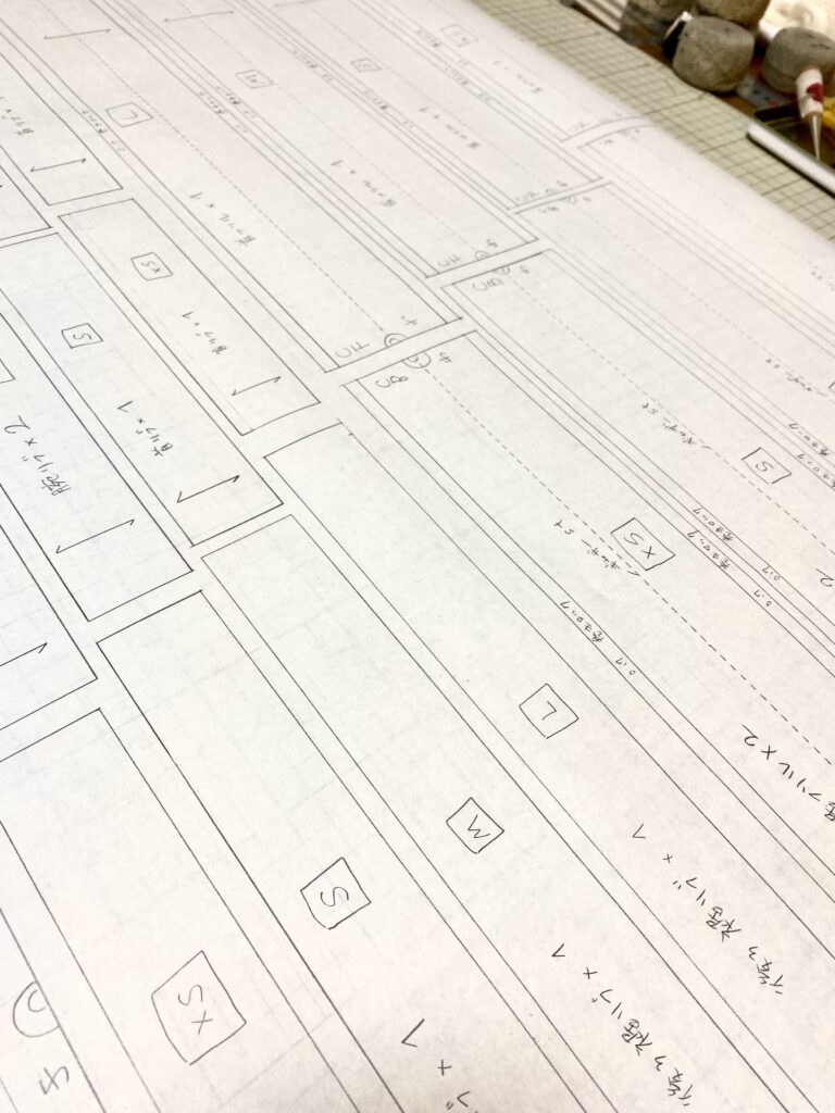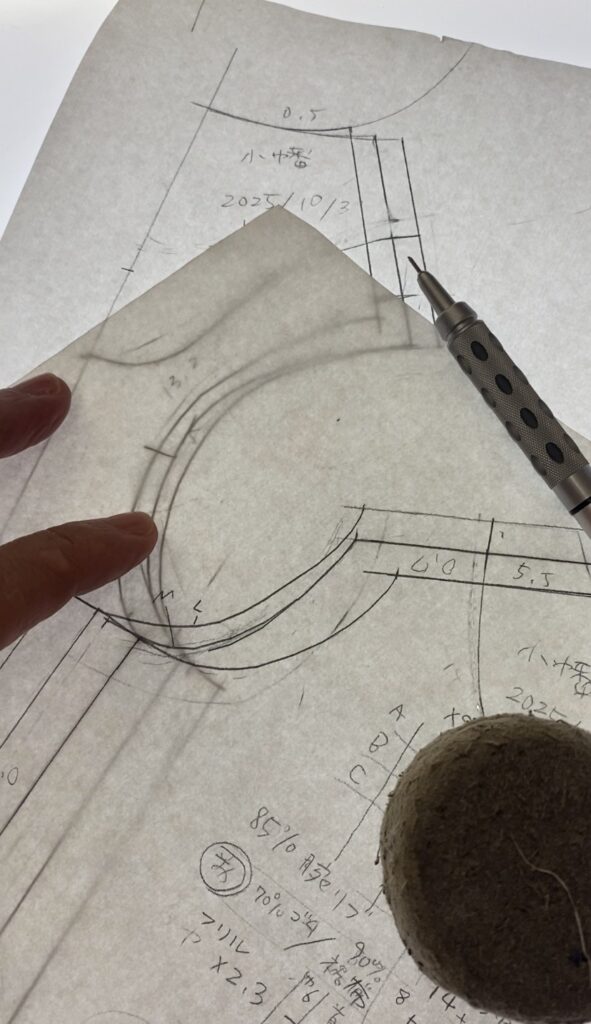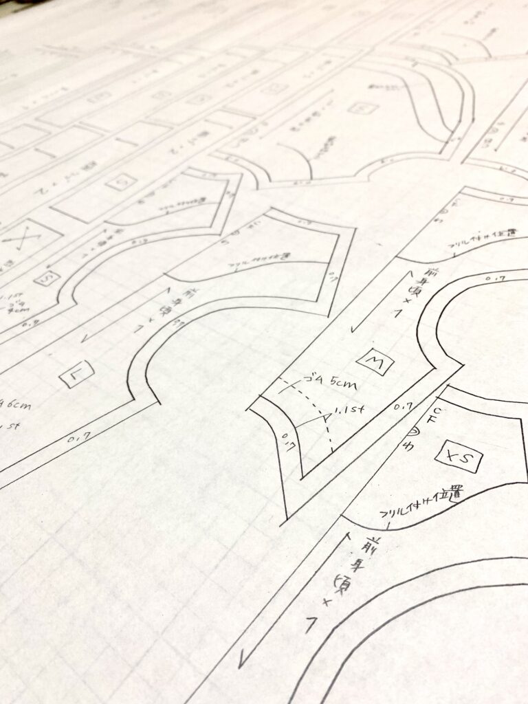 ゴーサインが出てから、グレーディングしていきました。グレーディングは重ねて書いていっちゃいました。複雑なデザインの場合は、1着ずつとか、2着ずつとかに分けて書いたりもします。