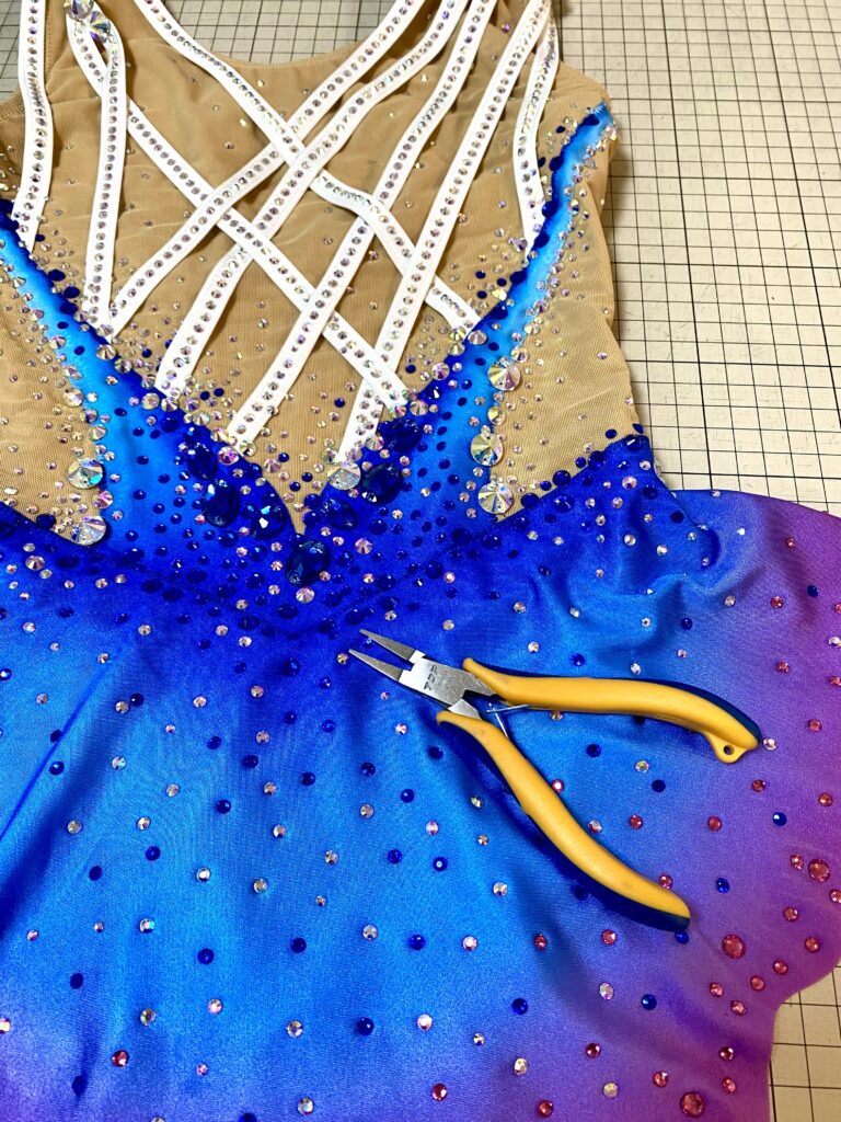 丈を短くするにあたって、ミシンで踏んづけそうなビジューは全て取り外します。ペンチで1個ずつ外していきます。これは、結構力が必要です。