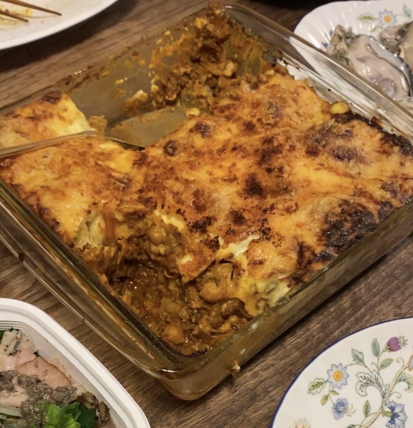キーマカレーのラザニアも作りました。私が作ったのはこれだけ。後は、友人や生徒さんが作って着てくれたり、買ってきてくれたり。いつもありがとうございます。