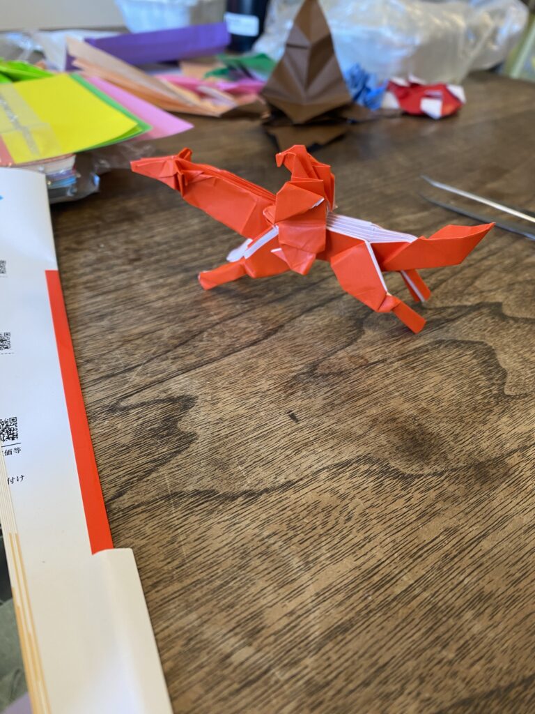 本の中からもう1個作りました。ドラゴンです。奥に見えるボクの手がちっちゃくてムチムチでカワユスですね。