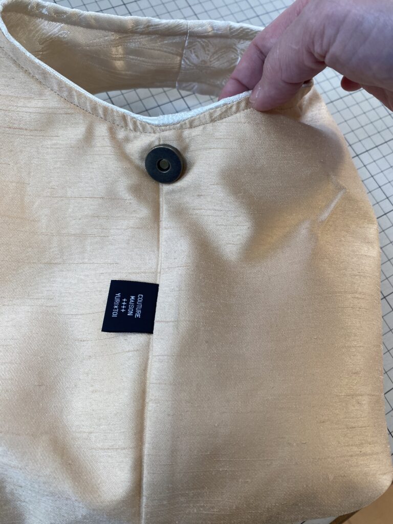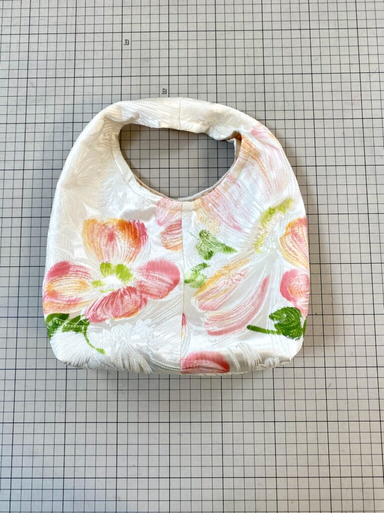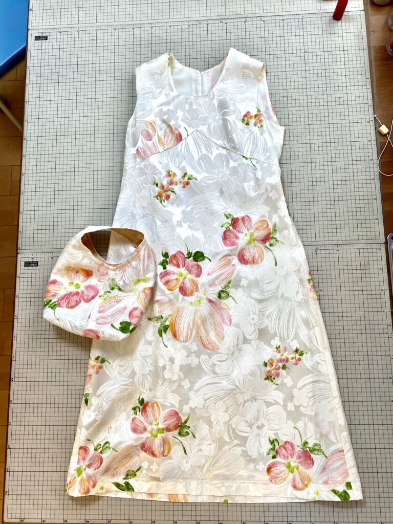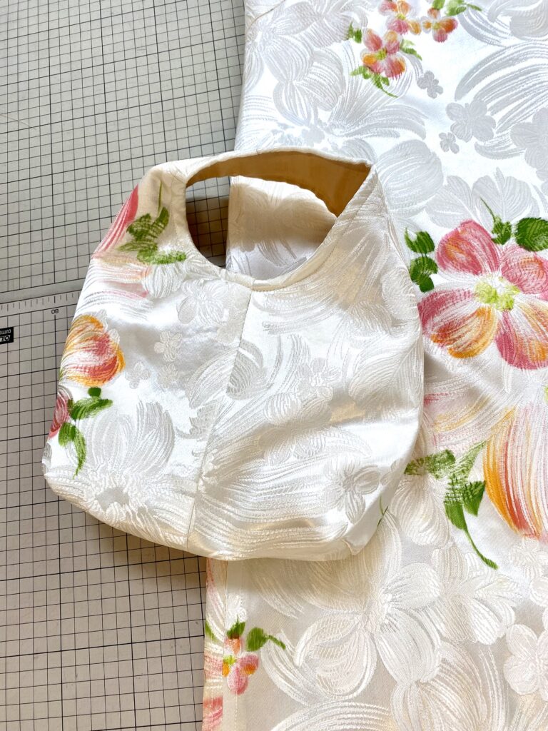 ウェディングドレスからのリメイクで、お袖と裾と衿を取り除きました。そのお袖からバッグを作りました。