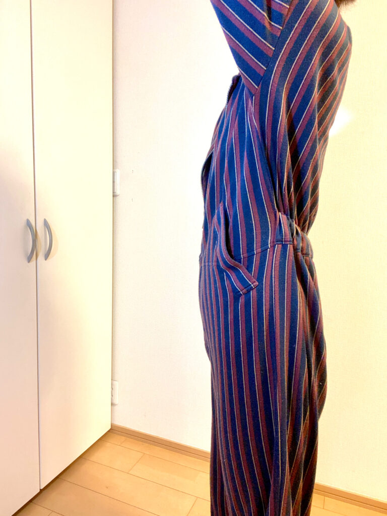 横から見るとすっきりのデザインです。ウエストラインをまたいで付けた箱ポケットが便利です。