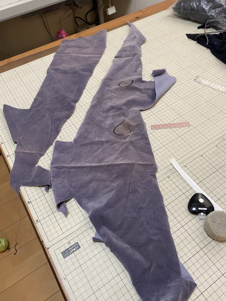 今回は、図解で縫製仕様書を作るために作った物で、工房にある生地を何とか見つけて作ったんです。かなりぎりぎりだったので、仕方なく細身になってしまいました。