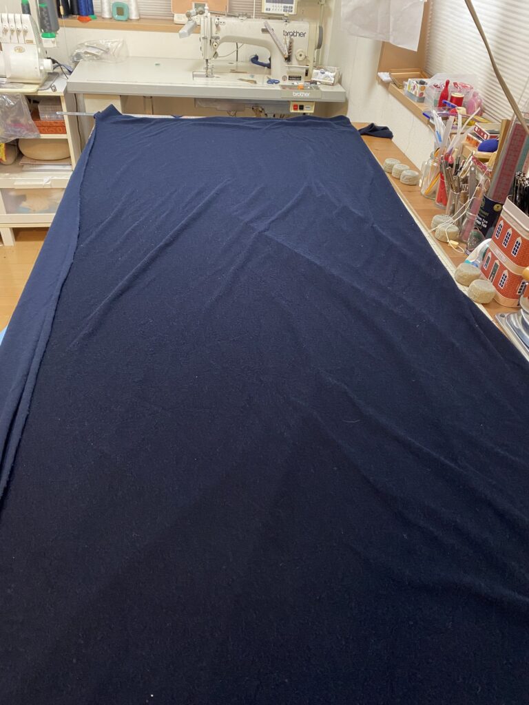 生地は、こちらで用意した物を使いました。とっても柔らかいパイルニット地です。幅広でとってもお得~!作業台の幅が1mなので180cm幅はあるニットです。素晴らしい~。