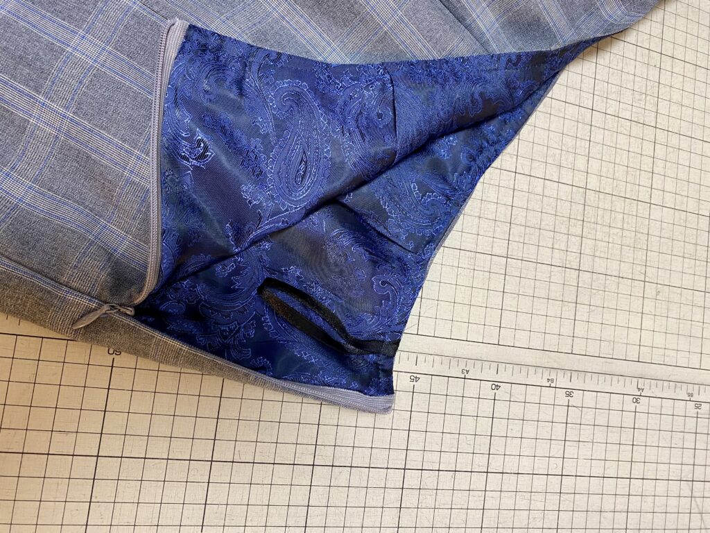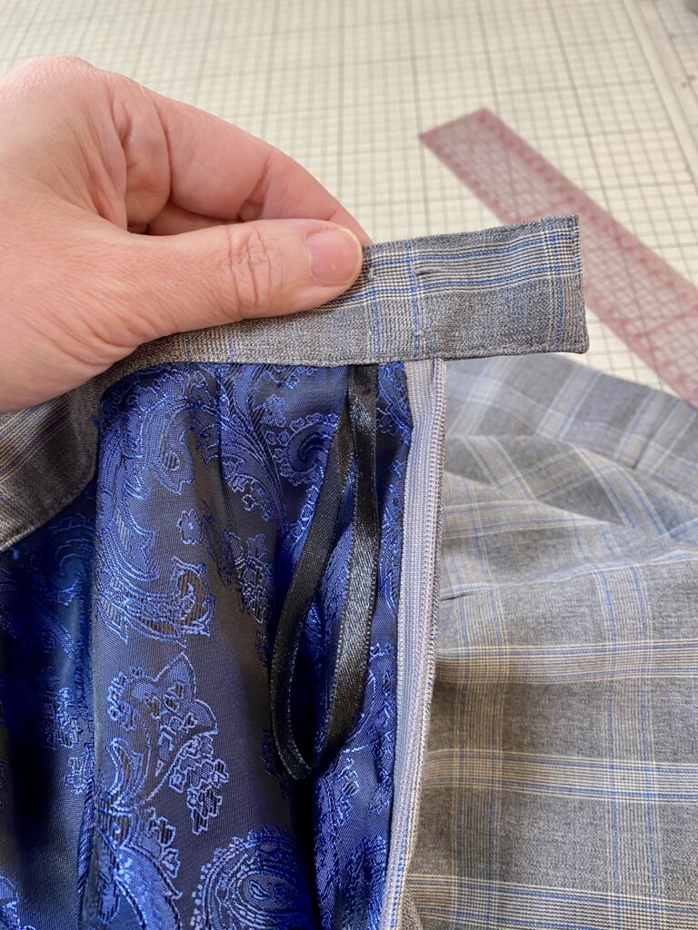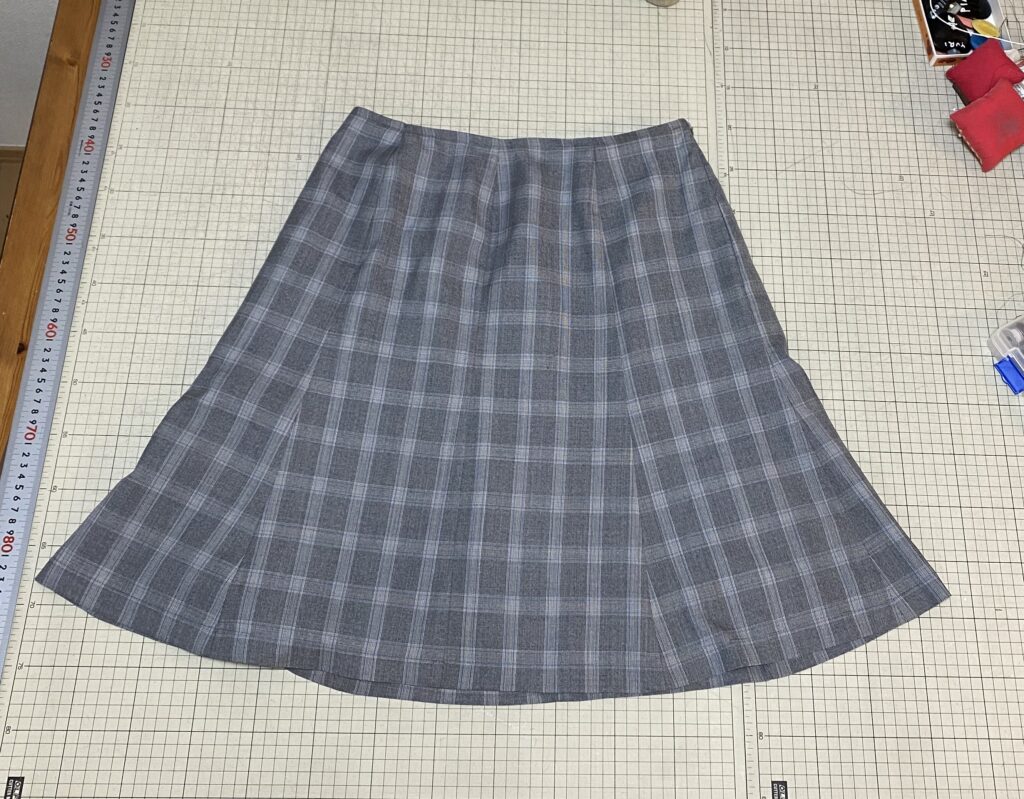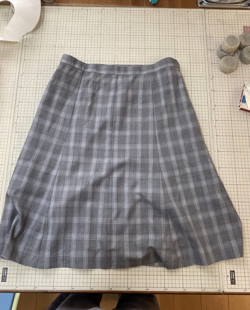 ウエストを10㎝、裾を5.5㎝短くします。更に、ベルトを外して、ベルトレスのスカートにします。