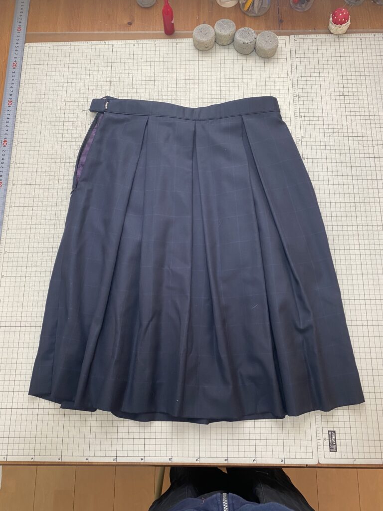 ベルト付きのタックスカートです。ベルトを取って、ウエストをマイナス10㎝、丈を6㎝詰めます。