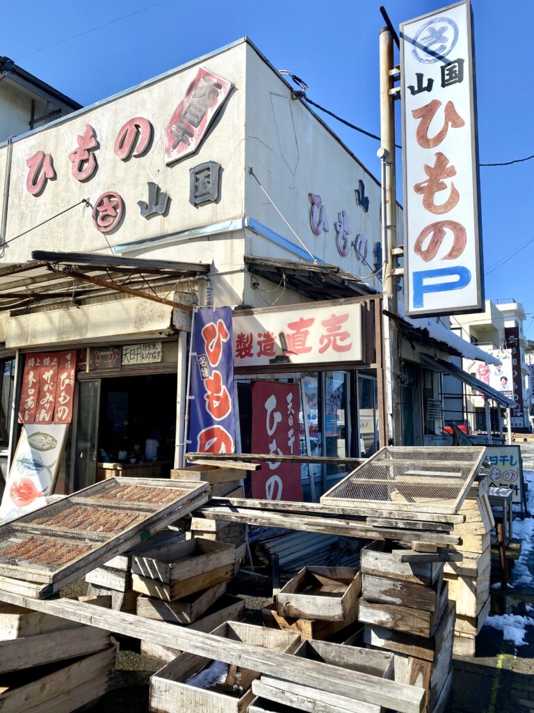 海沿いの干物屋さん。アジとサバを焼いて味見させてもらいました。