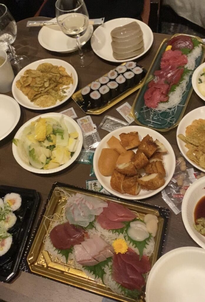 ホテルの部屋で宴会準備です。地物のお刺身、八百屋さんでゲットした白菜の浅漬け、お魚の練り物などを用意しました。