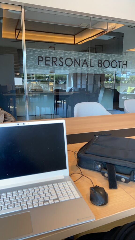チェックアウトはしたけど、友人がオンライン会議があるとの事でホテルのリモートスペースで仕事してました。友人がいるのはパーソナルブースと書かれている中。