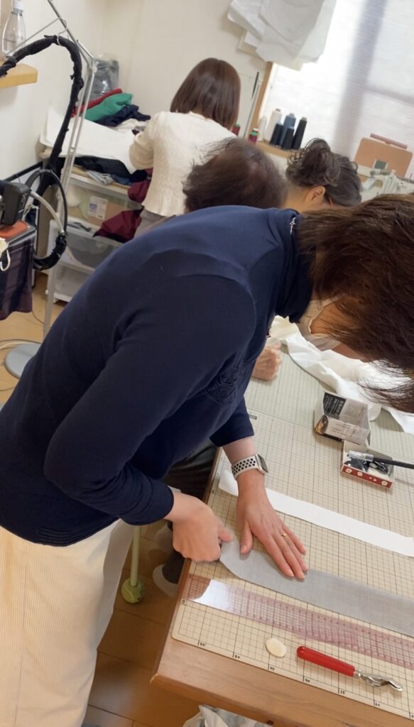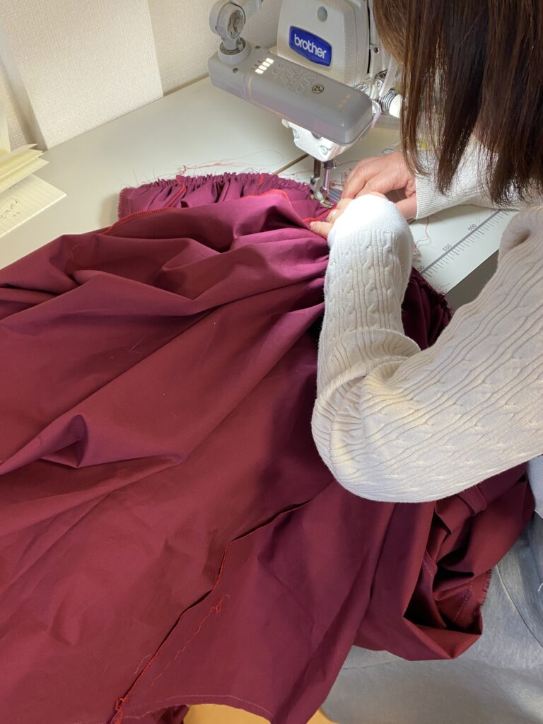 こちらの生徒さんは、フラメンコのスカートを作っています。一番の難関の、ギャザー部分をまさに縫製中です。きゅっと締まったウエストのヨークにフワフワのスカートを縫い付けています。