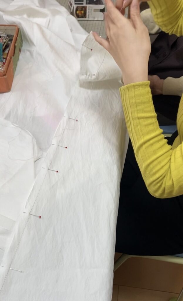 パネルラインがフロントとバック両方にあります。カーブが少し難しいです。難しい所だけ、しつけをしてミシンを縫っていきます。直線の所は、ピンを外しながら縫っちゃいます。