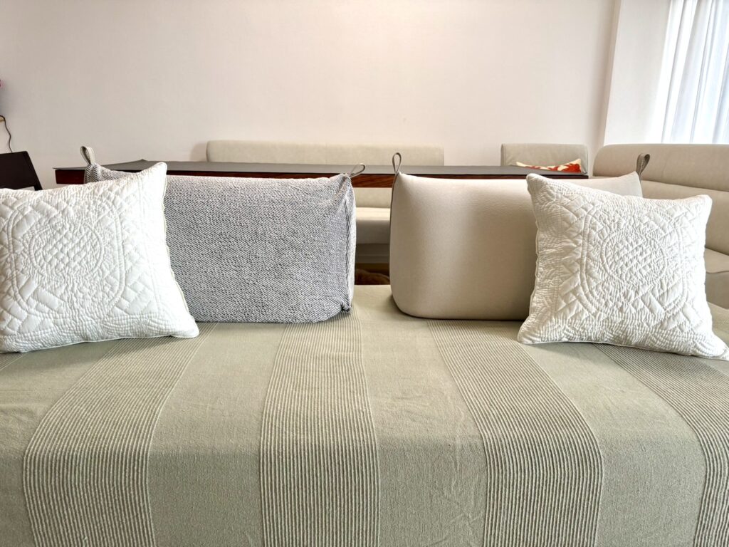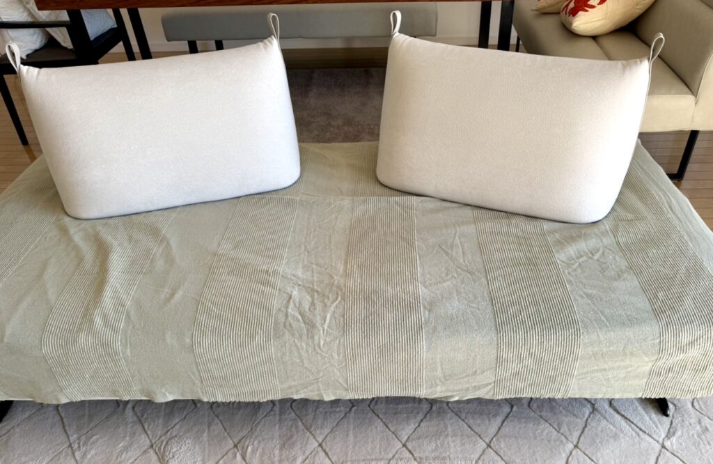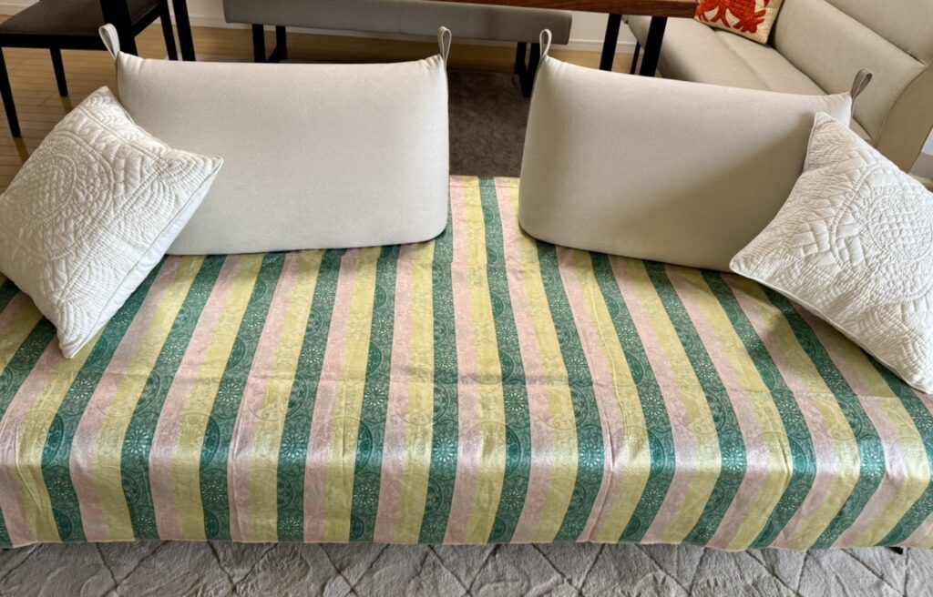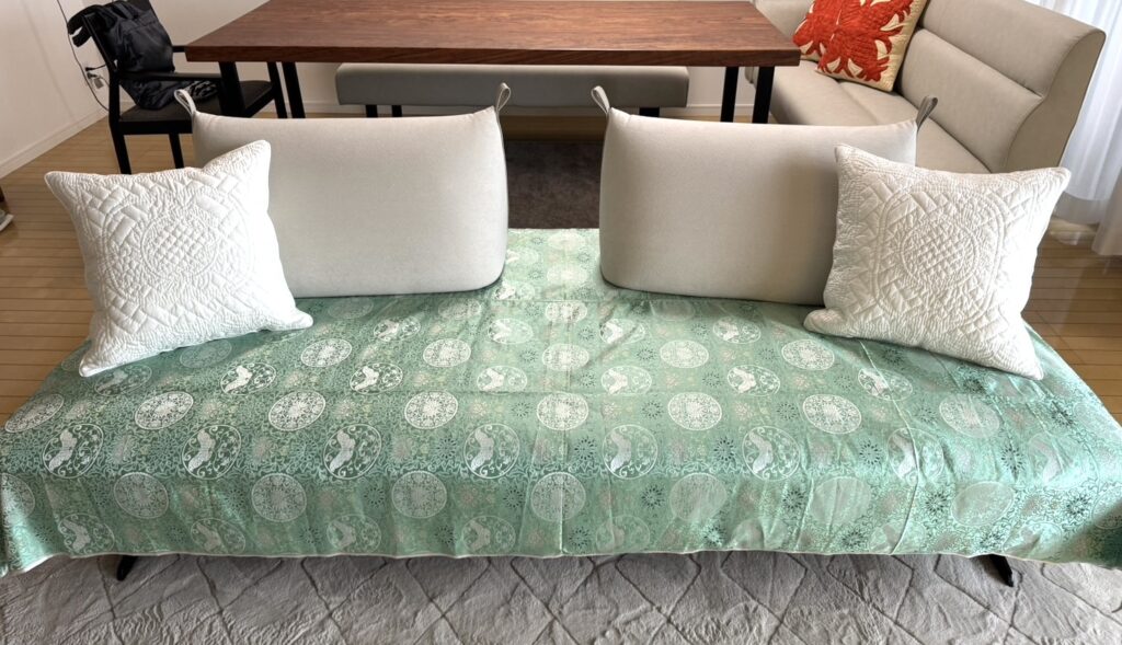 こちらは、IKEAのベッドカバーを再利用して作ったソファーカバーです。これも良いですね。