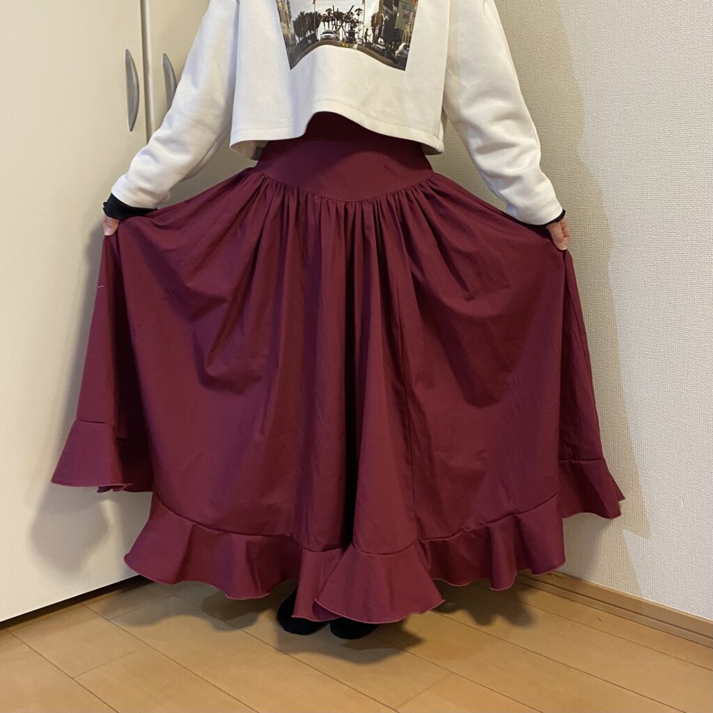 フラメンコの先生からお借りしたスカートを完コピして作りました。詳しくは、こちらをご覧ください。