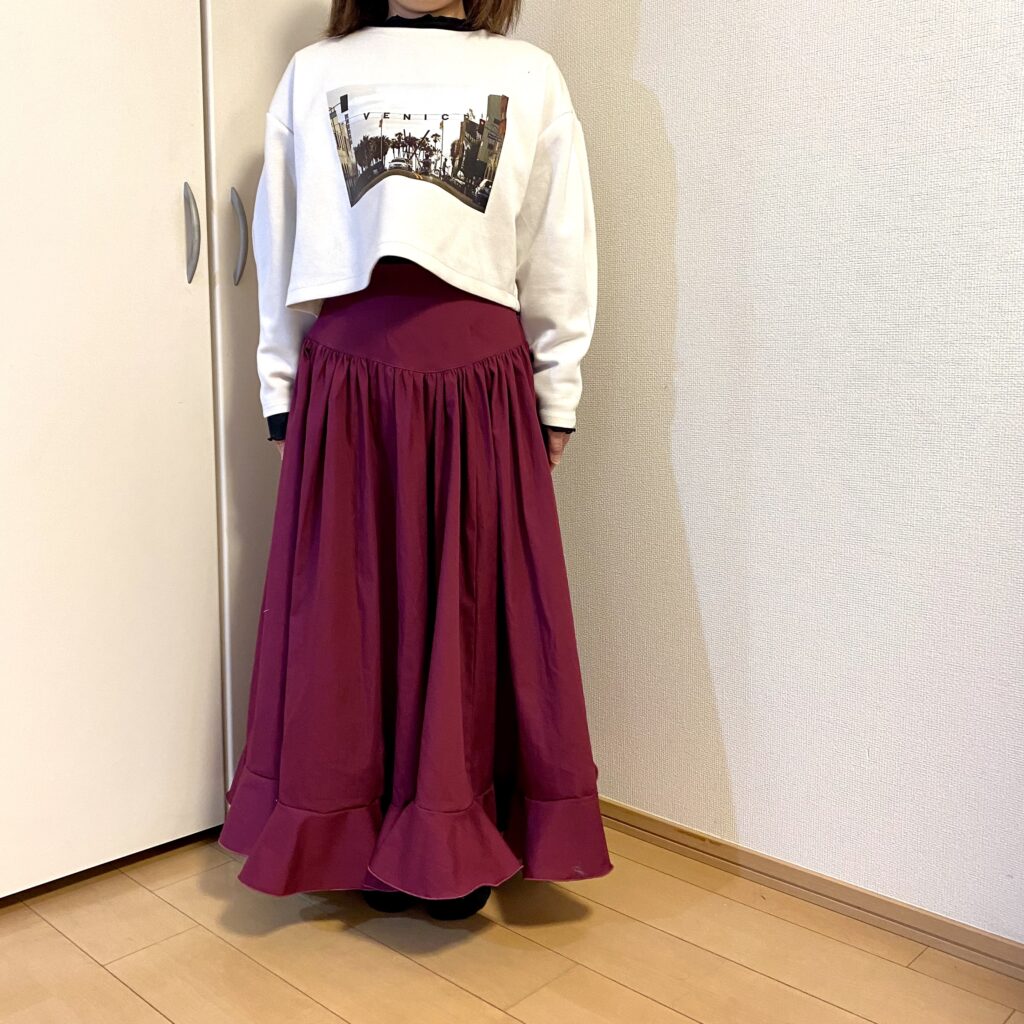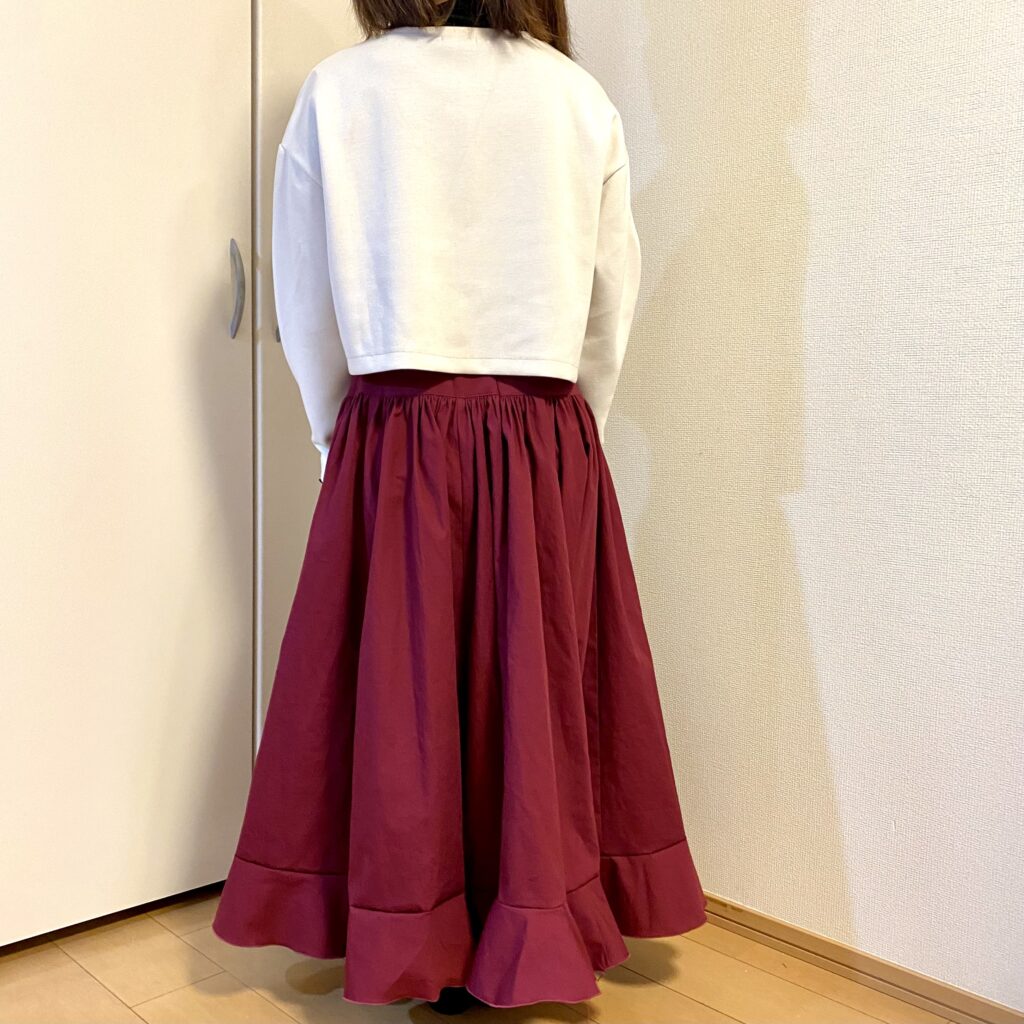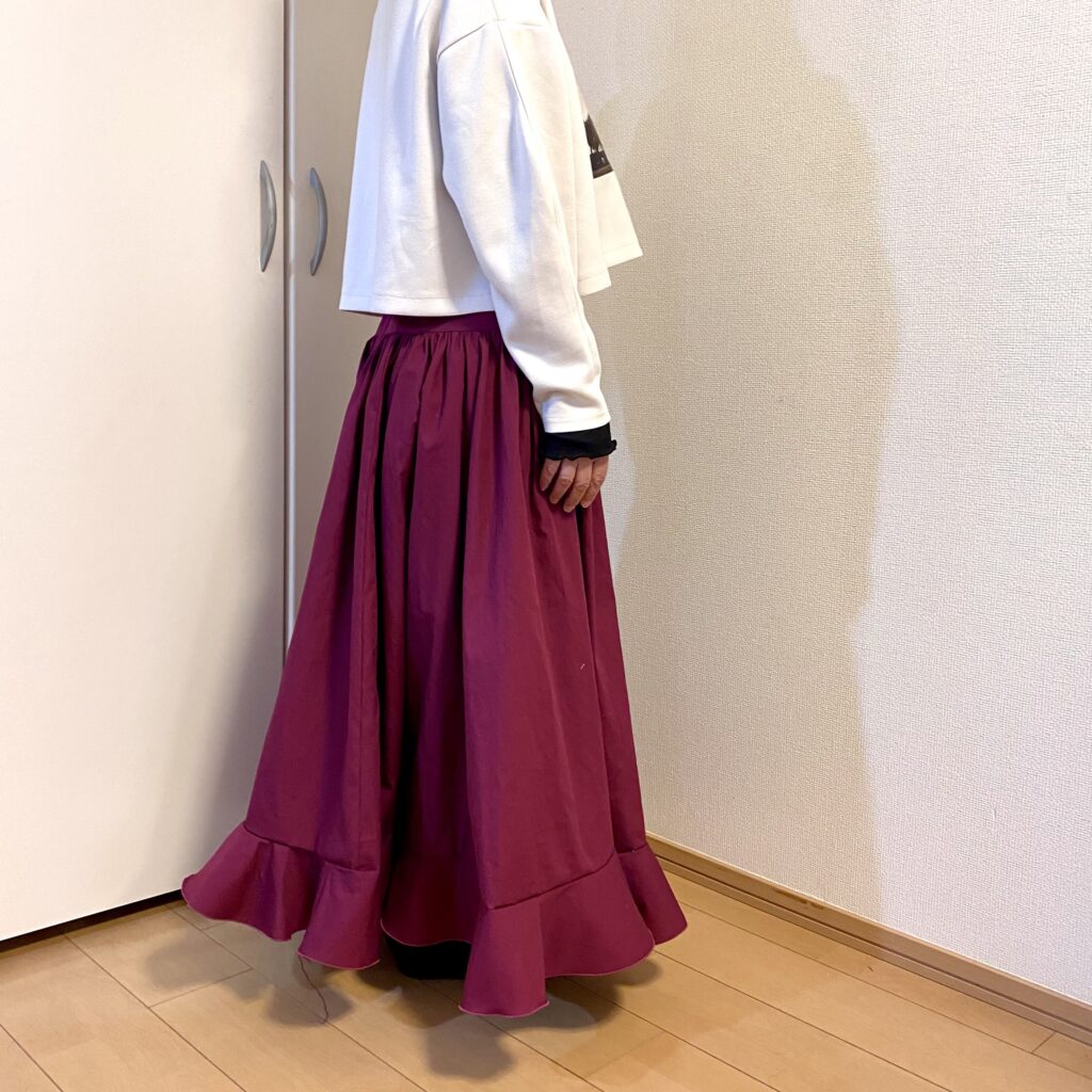 裾のフリルは巻きロック仕上げにしました。