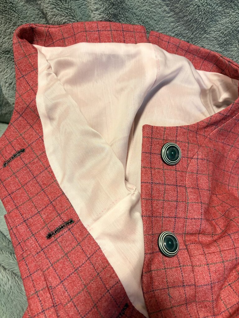 チェック柄で前開きのジャンパースカートです。スカートはタックがあるように見えますが、タックではないです。スカートに丸みを付けてます。
