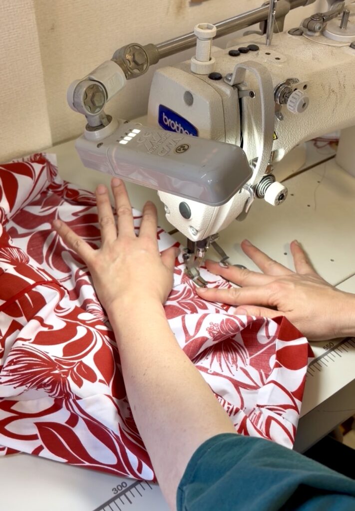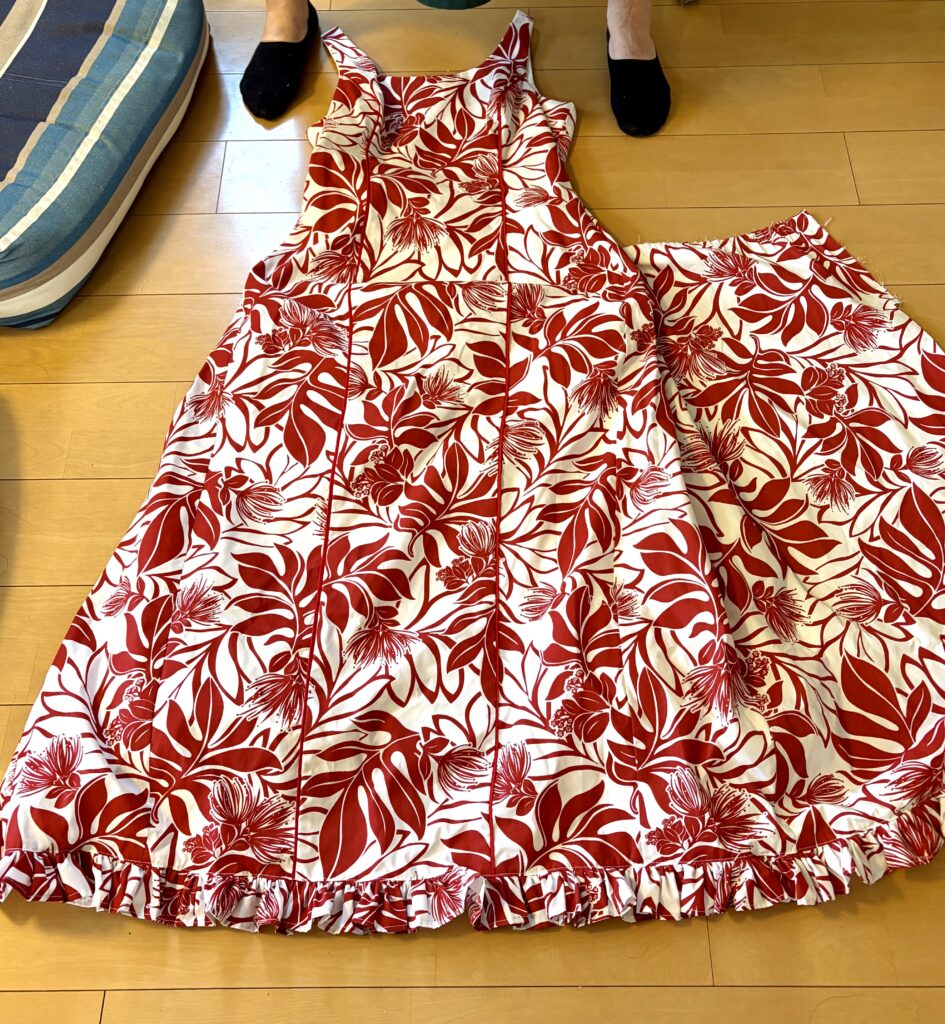 こちらの生徒さんは、フラダンスの衣装を解体しようとしています。フラダンスは複数で踊る物で、もうこちらの衣装では踊ることがないという事で、リメイクします。