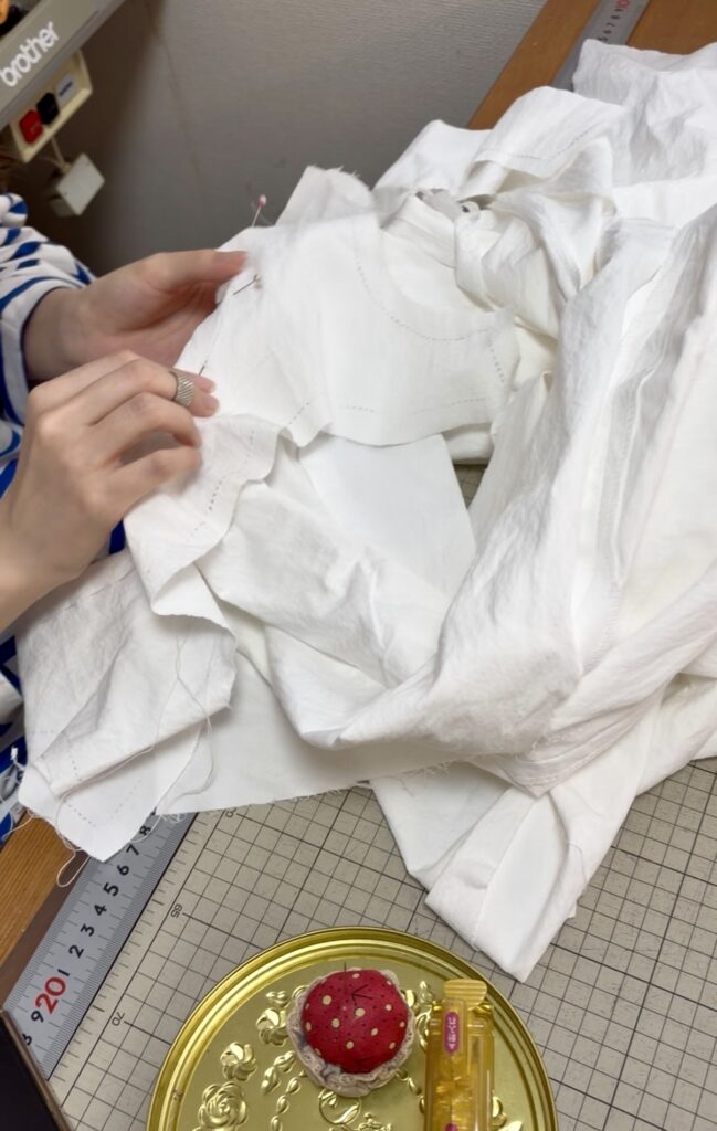 昨日の教室風景を紹介します。こちらの生徒さんは白のコットンでワンピースを作っています。見返しを付けている所。難しい箇所なので、しつけ糸でしつけをしている所です。