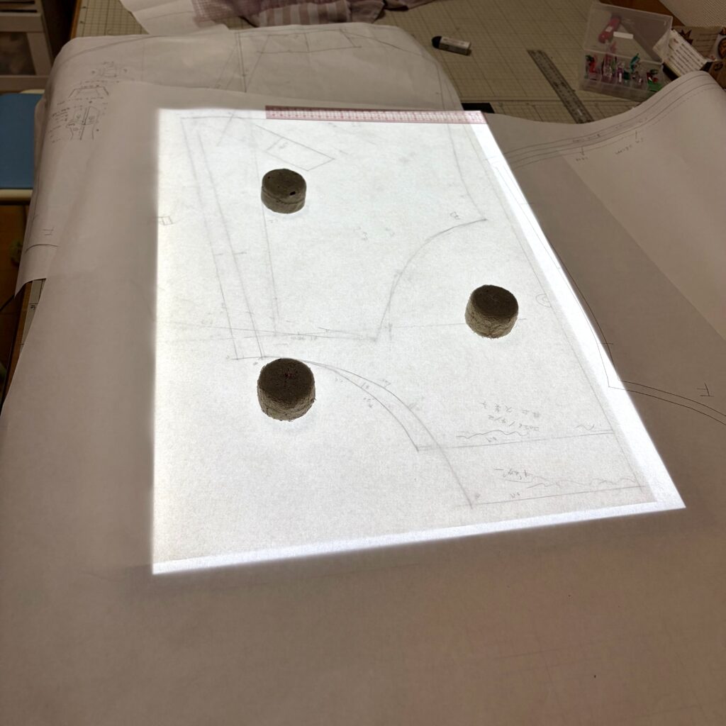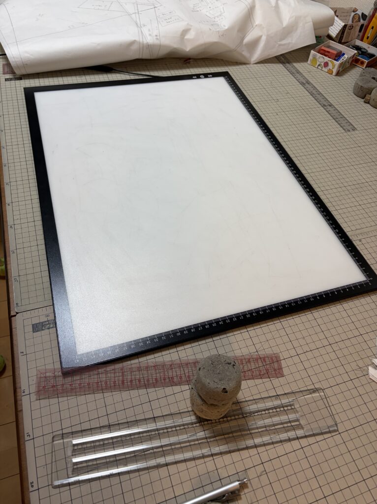 使っているのはA2サイズのトレース台です。洋服の製図にはこれくらい大きくないとです。A1サイズもあるのですが、保管も大変ですし、グーンと値段が高くなります。