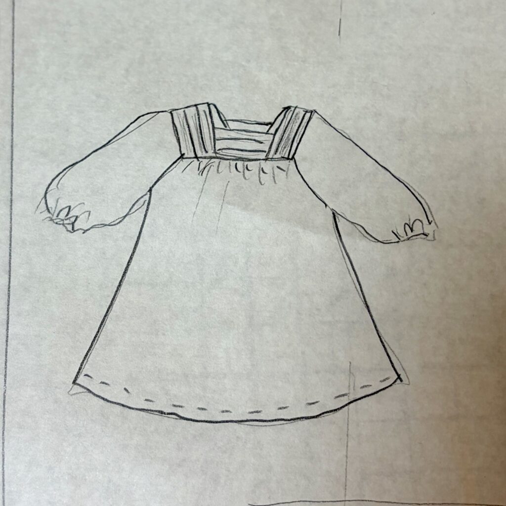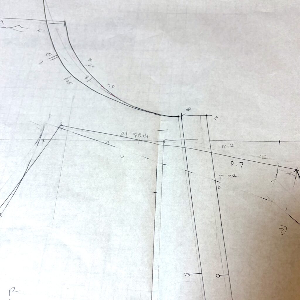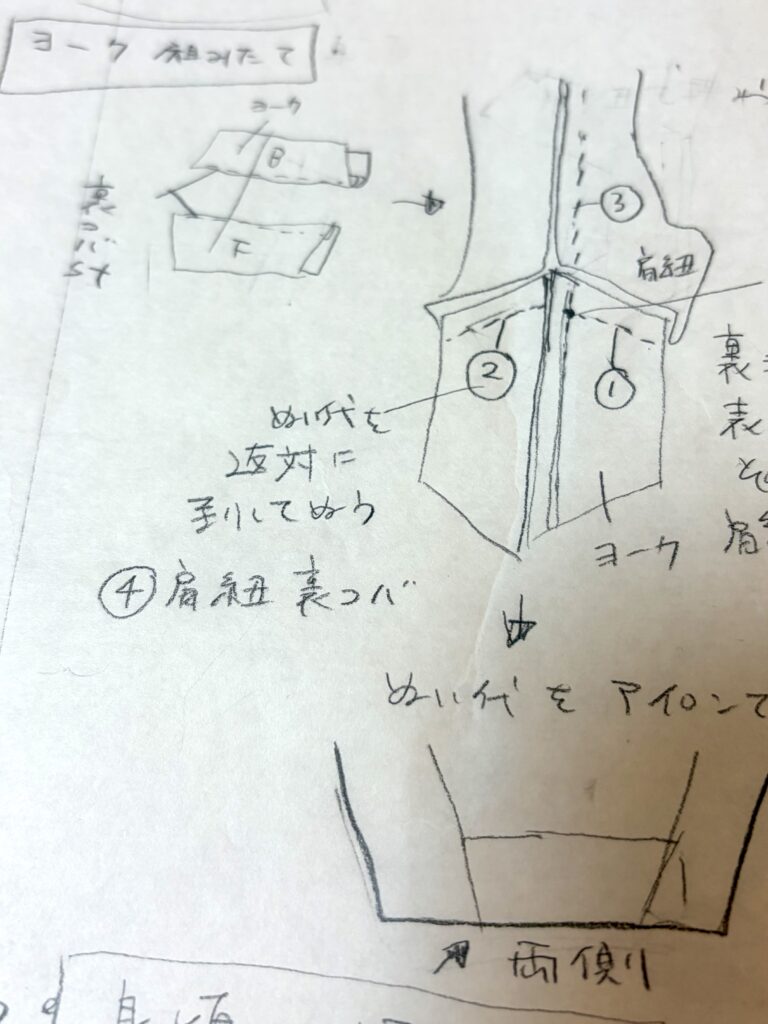 この後、縫製仕様書も書きますが、ヨークの組み立てがちょっと難しいです。図解をするのに苦労しています。型紙に下書きしちゃってます。
