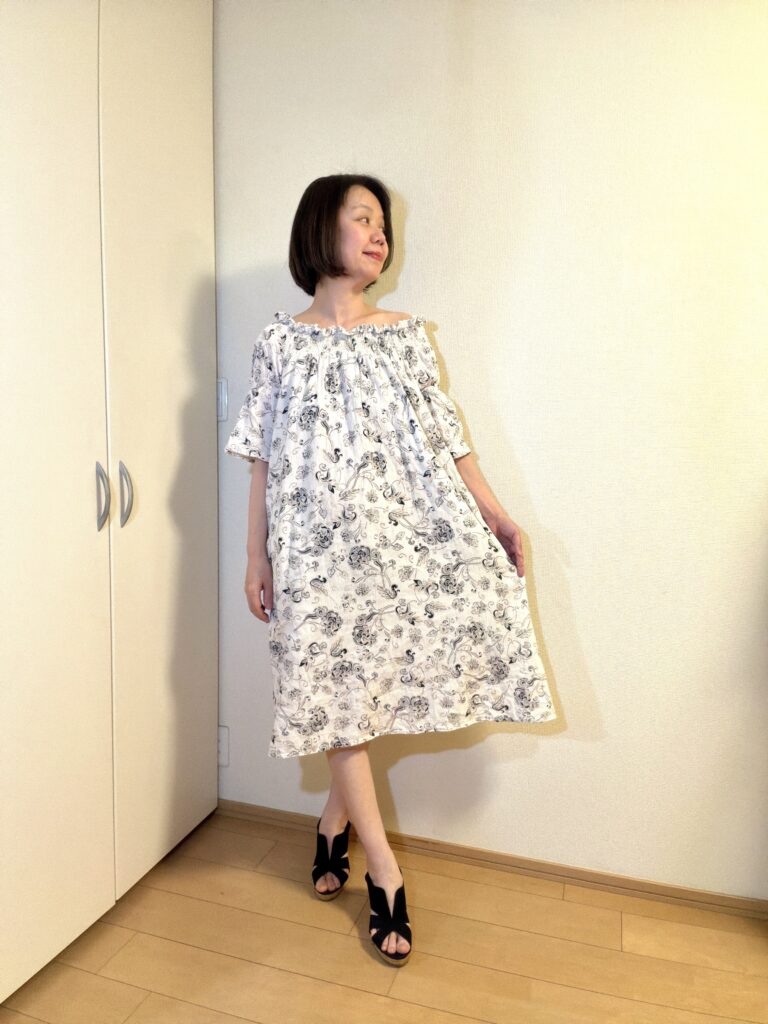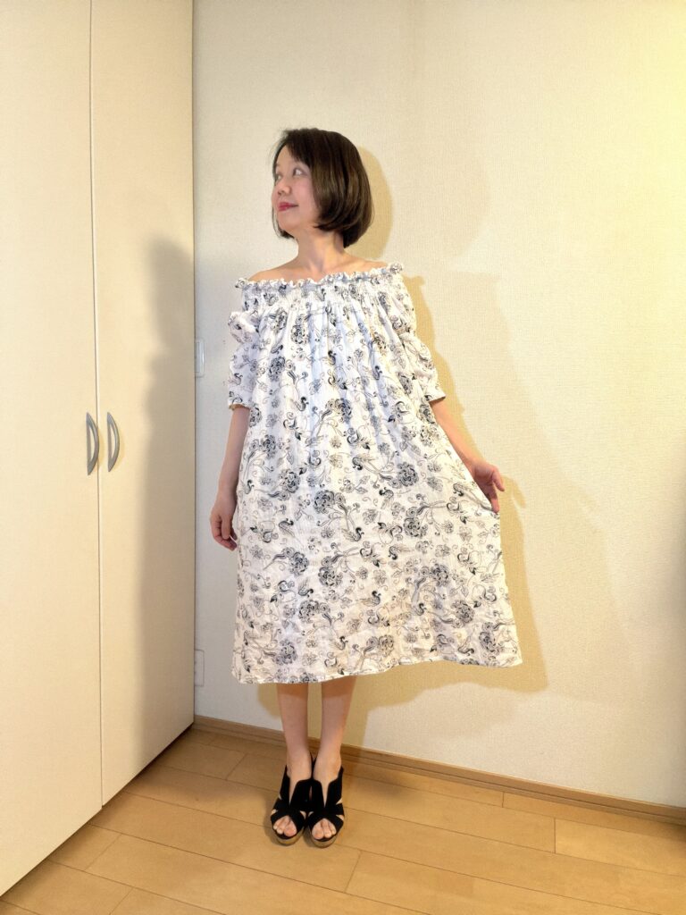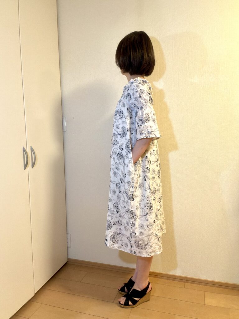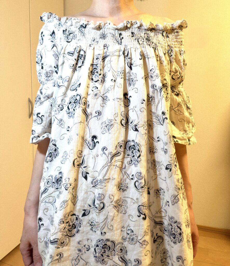 肩から襟ぐりをぐるりとシャーリングしています。2019年に作ったものだそうですが、シャーリングはまだまだ緩んでいません。