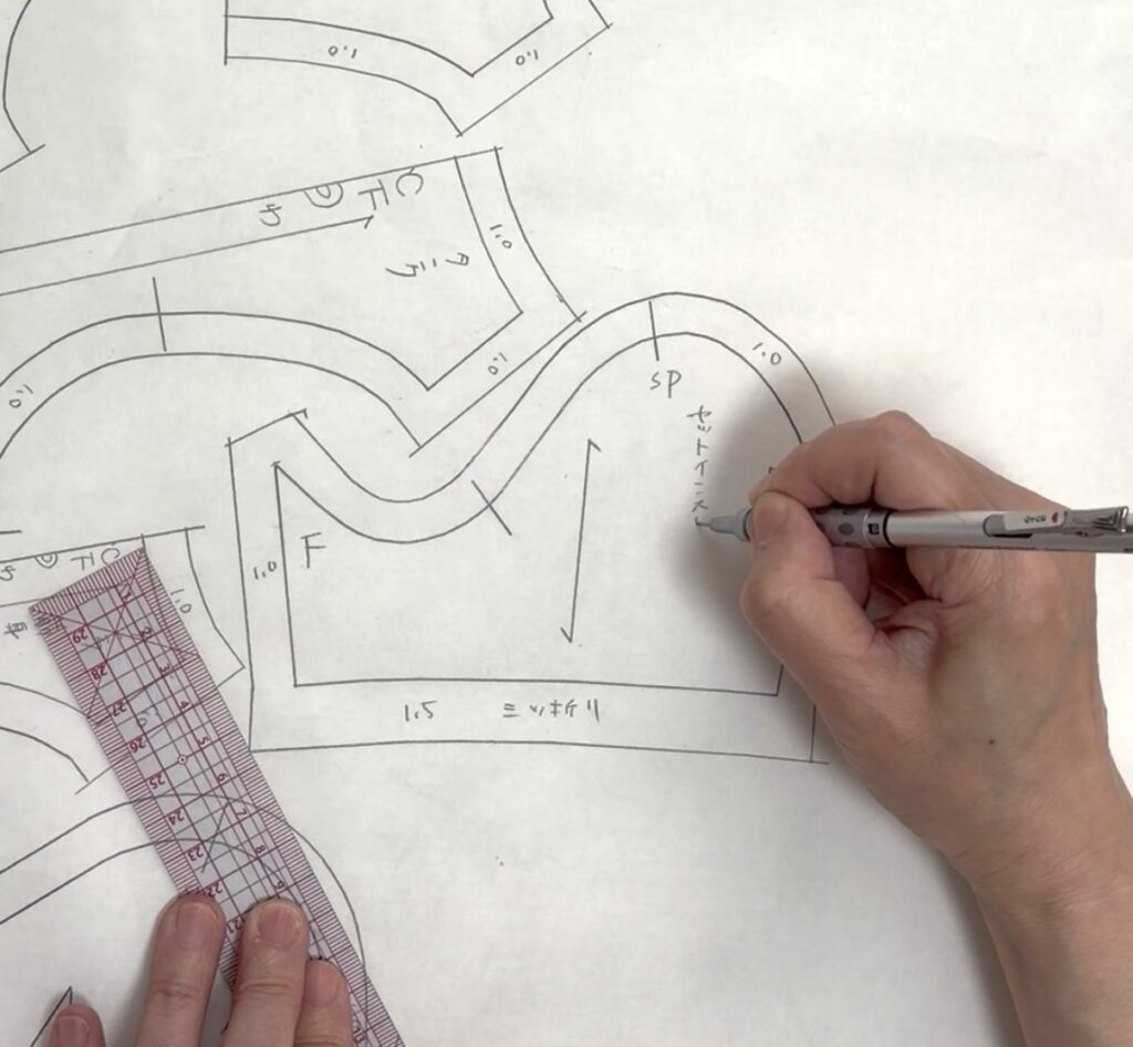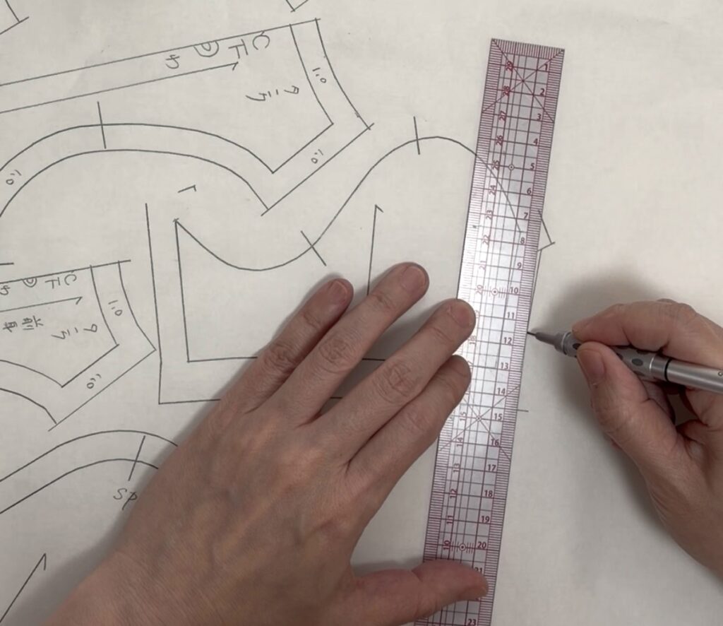 元の型をトレースしたら、ライトを消して縫い代を付けていきます。縫い代はその都度付けるようにしています。線がいっぱいになってしまうので、元の型紙には書きません。