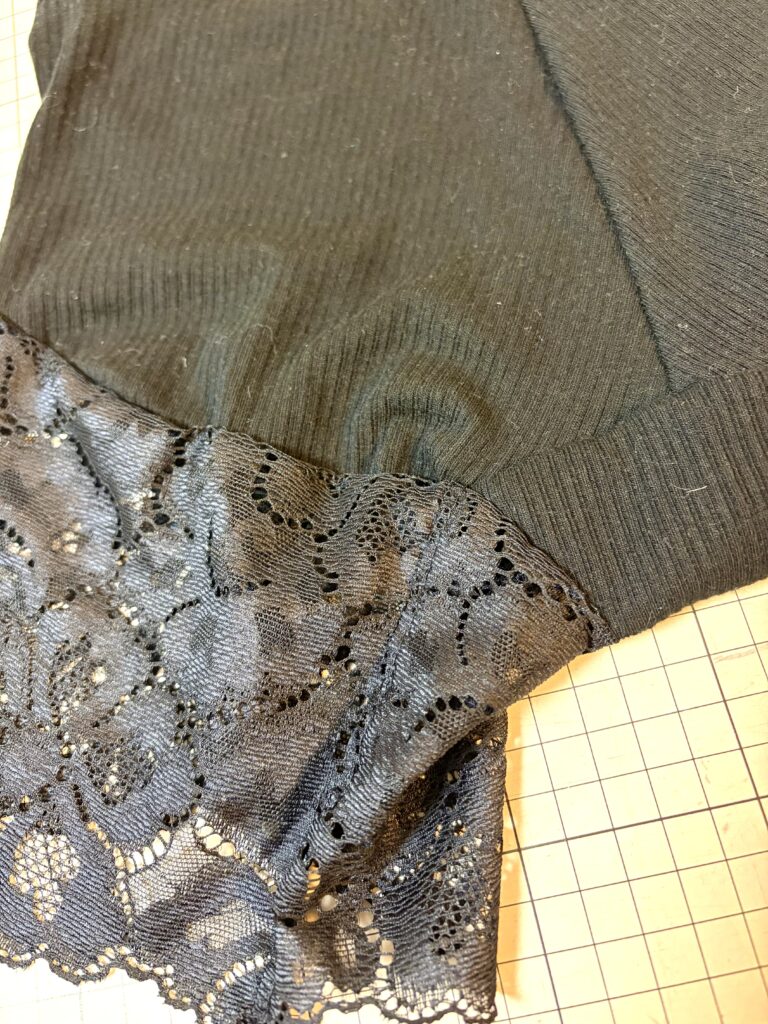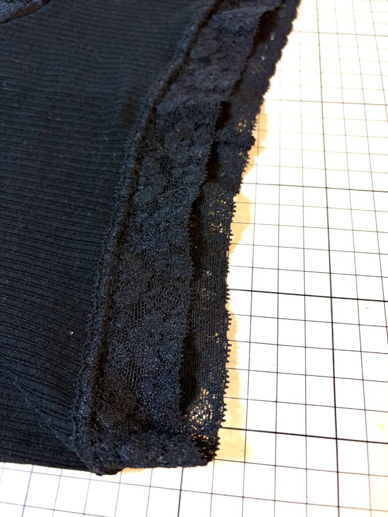 ウエストのレースは、よく伸びるものがお勧めです。ウエストに使ったレース地はとてもよく伸びる物です。ストレッチレースはなかなか見つけるのが難しいですが、楽天の手芸ナカムラでギャンブルで購入しています。あんまりハズレなくてお勧めです(笑)