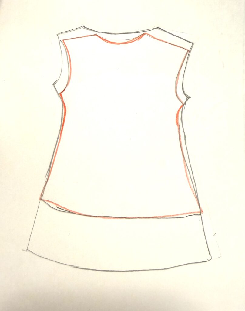 図解するとこんな感じです。もともと、ワンピースだったので、丈は詰めなければならなかったので、下にずらせば良いのでは?と。ばっちりでした。赤い線がリメイクした線です。襟ぐりを詰めて作り直しました。