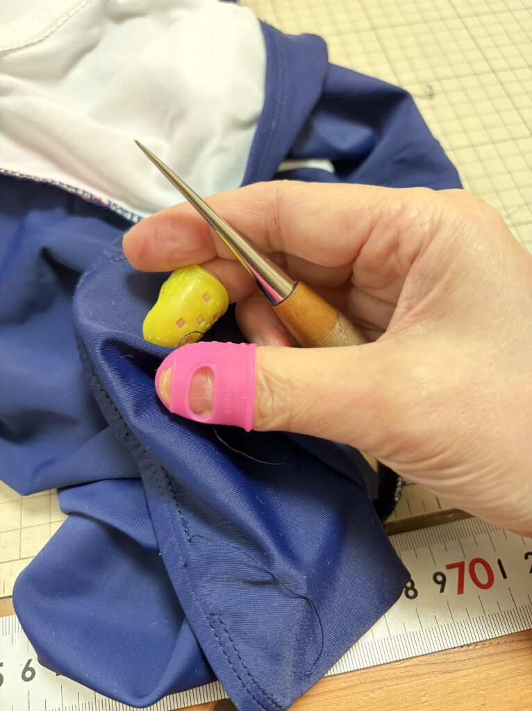 持ち手が太めでコロンとしていて、持ちやすく少ない力で糸を引っ張る事が出来ます。ちょっとだけ解くのなら、他の目打ちでも問題ないかもしれないですが、お直しの仕事だと、長い距離解かないといけない場合も多いです。目打ちも重要な道具になります。