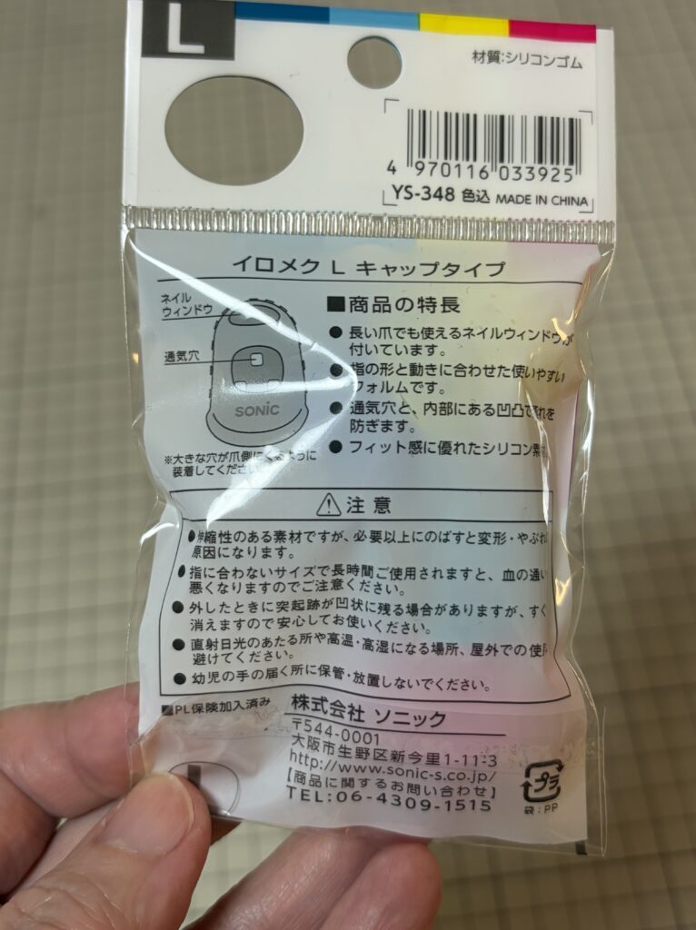 しかし、間違えて買ったLサイズは、親指にぴったりでした。今までは、Mサイズを無理やり親指にもはめていましたが、これはきつくなくて良いわ。いつまでも嵌めていられそうです。